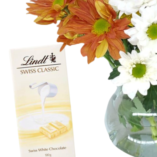 A combinação perfeita entre um vibrante arranjo de flores mistas e o clássico sabor do chocolate Lindt Swiss Classic White. Este presente traz a leveza das flores frescas em tons de amarelo, lilás, laranja e branco, acompanhadas pelo irresistível chocolate branco suíço Lindt, conhecido por sua textura suave e cremosa. Ideal para surpreender em datas especiais ou para transformar qualquer momento em algo memorável.
